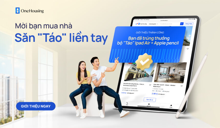 Bộ giải thưởng 01 iPad Air và 01 bút apple pen với tổng giá trị 20 triệu (đã gồm VAT) đang chờ đợi chủ nhân mới. Cùng OneHousing đón chào ưu đãi mới nhất Mời bạn mua nhà, săn “Táo” liền tay tri ân những khách hàng của OneHousing.