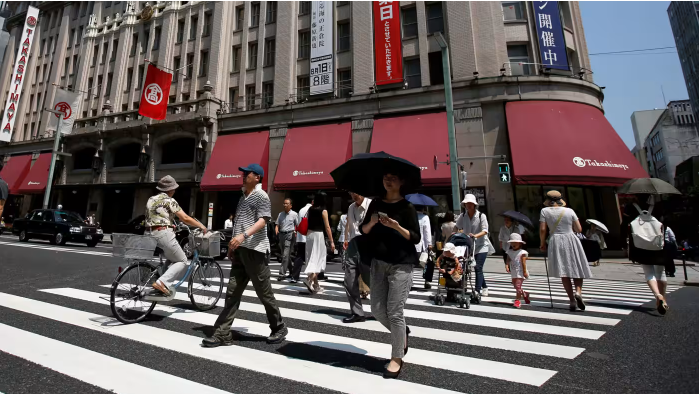 Người qua đường đi bộ trước trung tâm mua sắm Takashimaya ở Tokyo. Ảnh: Reuters